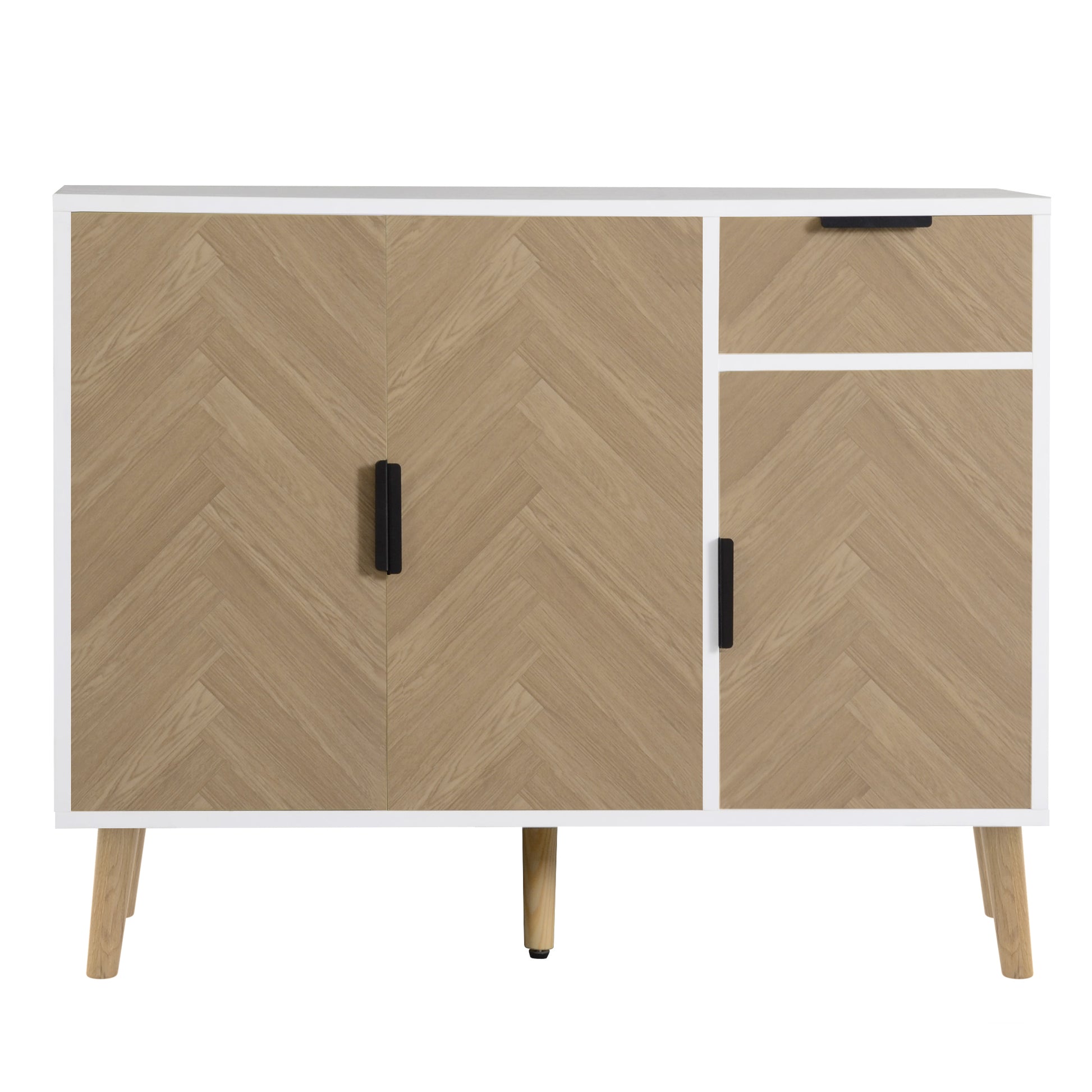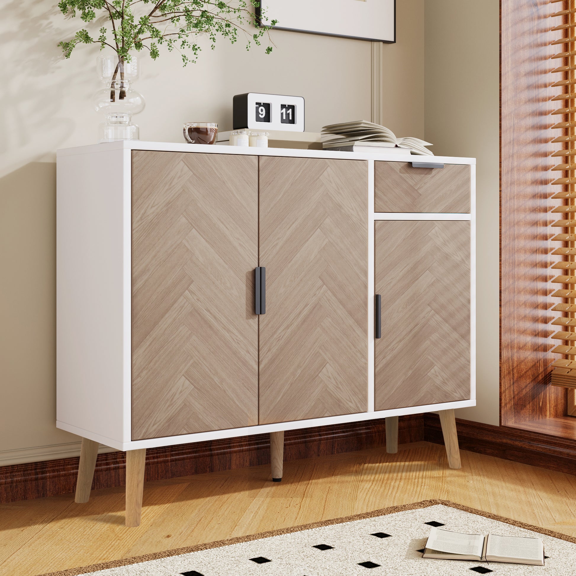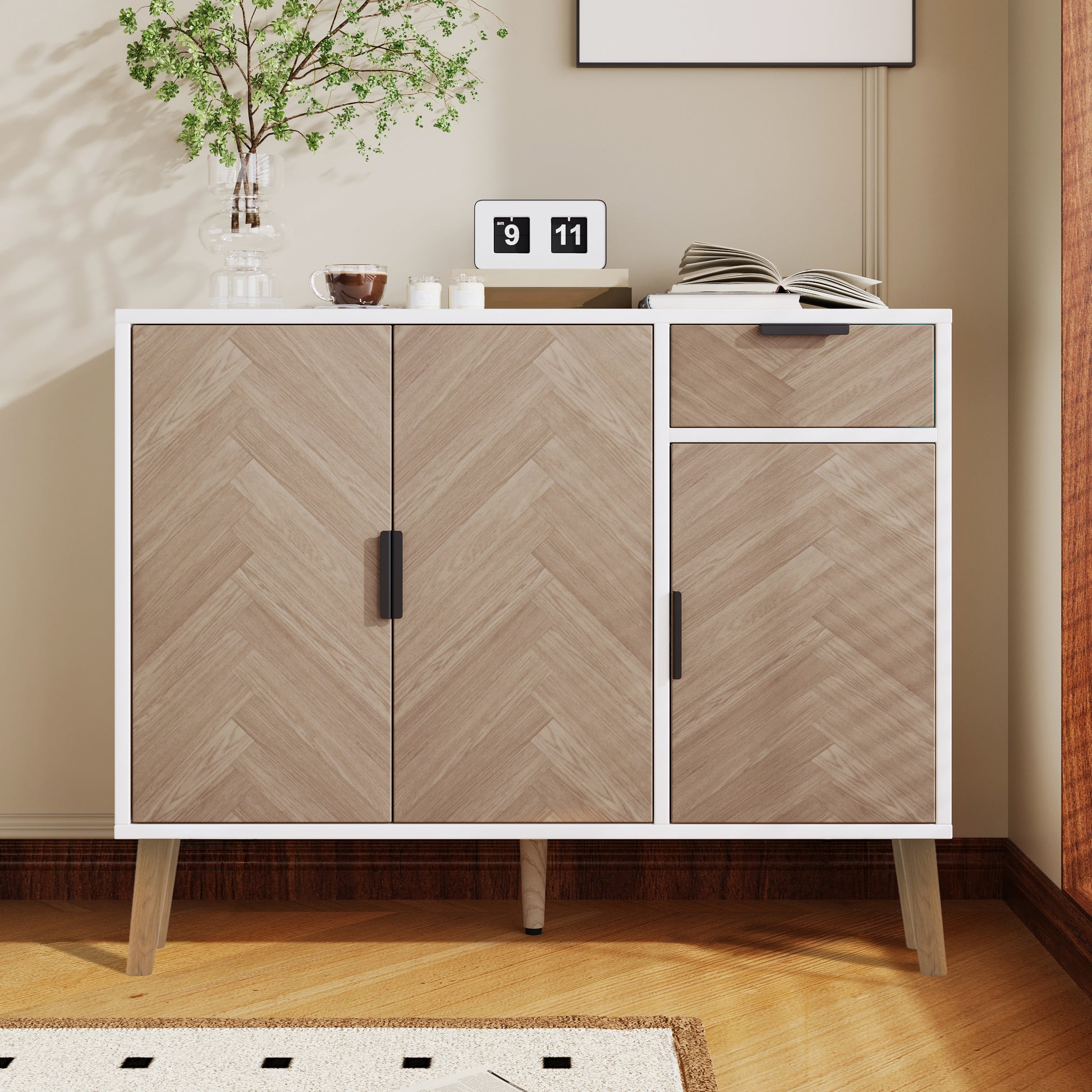 A clean white frame paired with soft wood-pattern chevron doors gives this compact cabinet a warm, lifted look the moment it’s placed in a room. Its balanced proportions make it an easy fit for entryways, living rooms, or smaller corners that need both style and smart storage. The contrast between the crisp body and textured doors adds subtle depth without overwhelming your space.