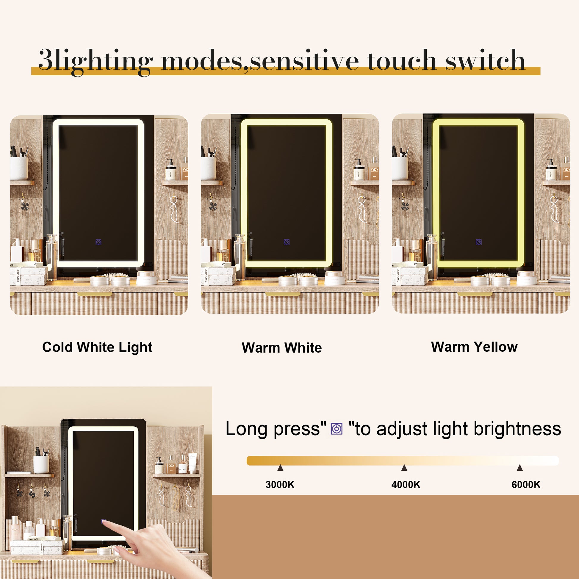 - Integrated LED mirror with three adjustable lighting modes for adaptable makeup application