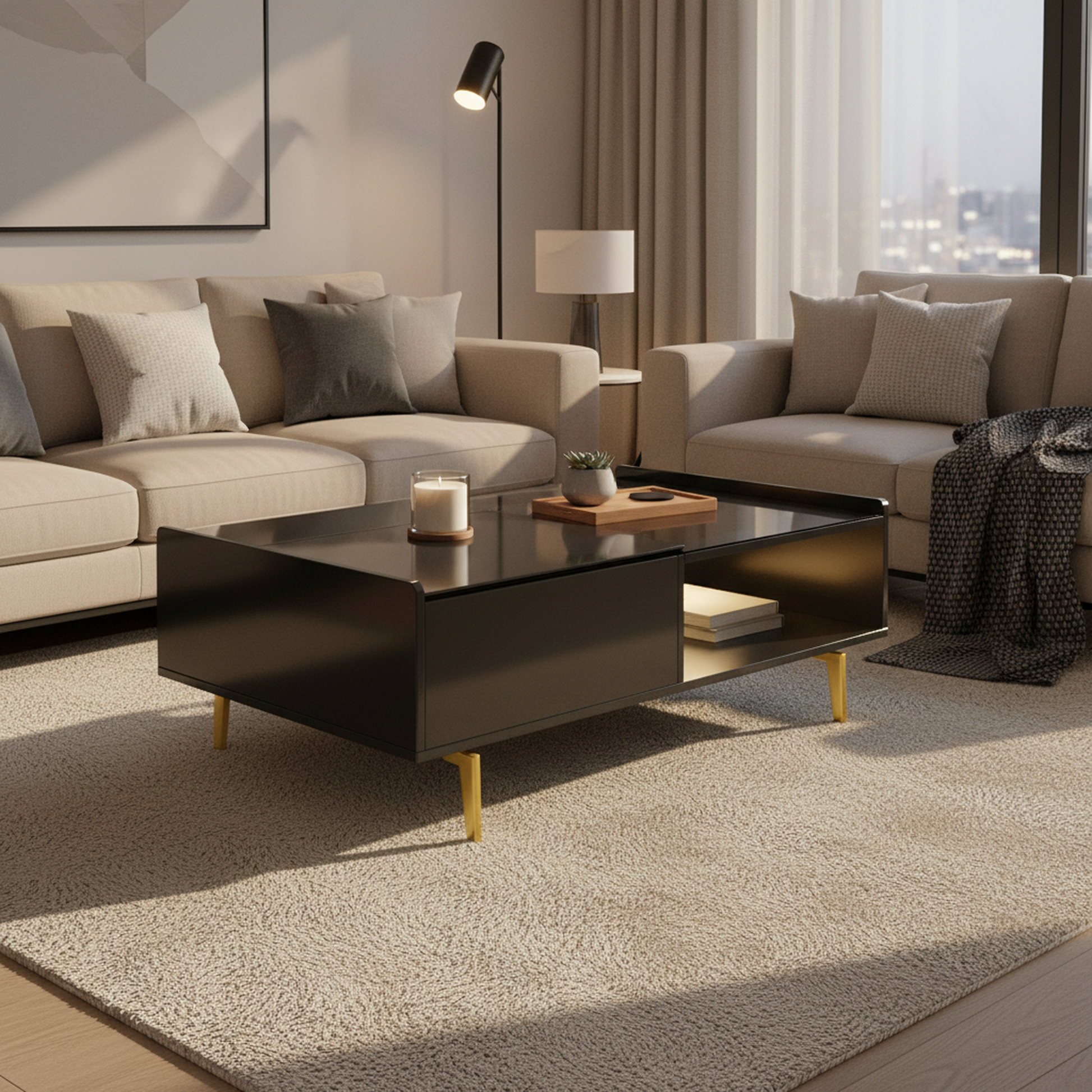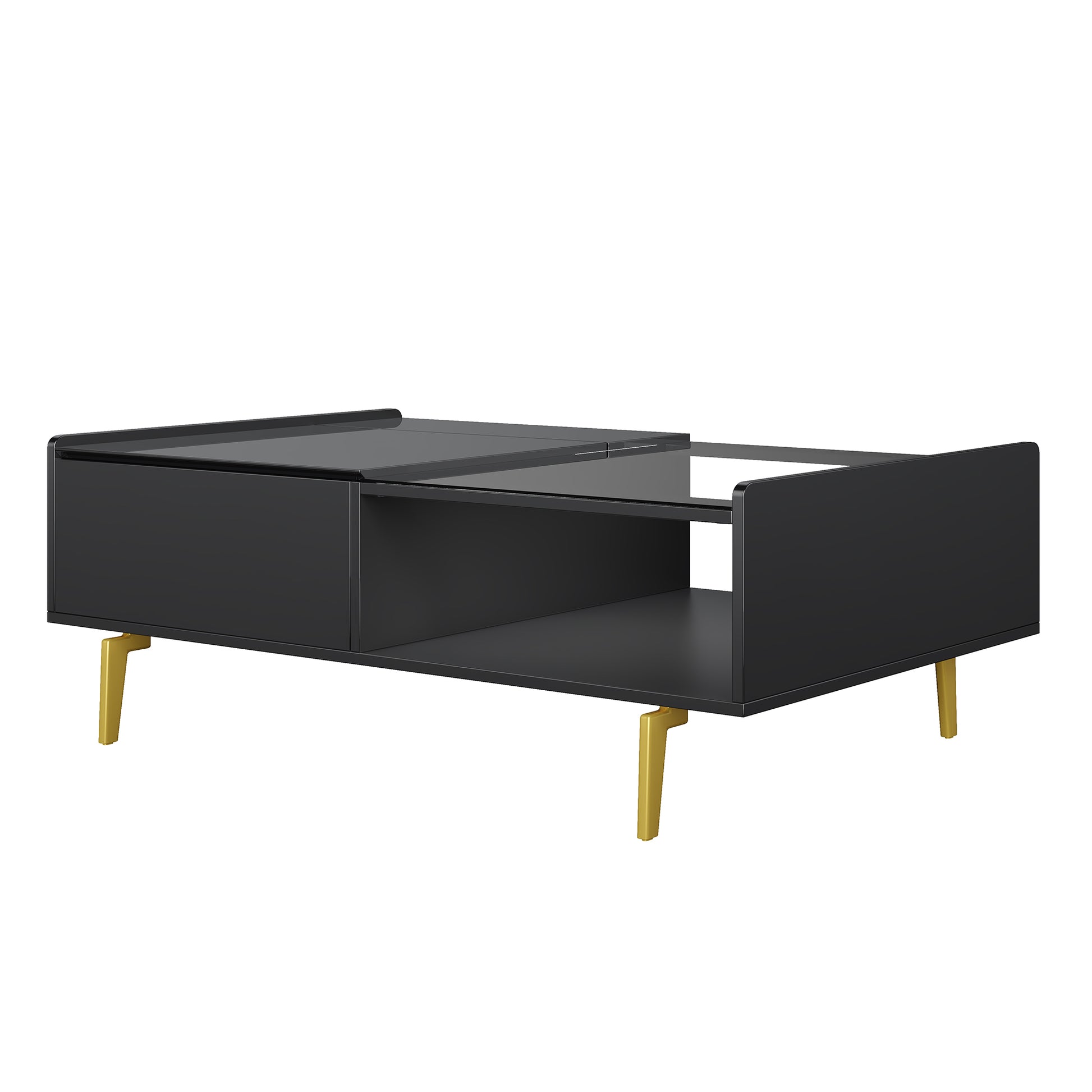 Designed for modern Canadian homes, the Aurora coffee table brings together high-gloss style, adaptable function, and warm ambient lighting. Its reflective black finish and gold-tone legs create a polished centrepiece, while the lift-top surface transitions easily between casual meals, laptop work, and everyday living.