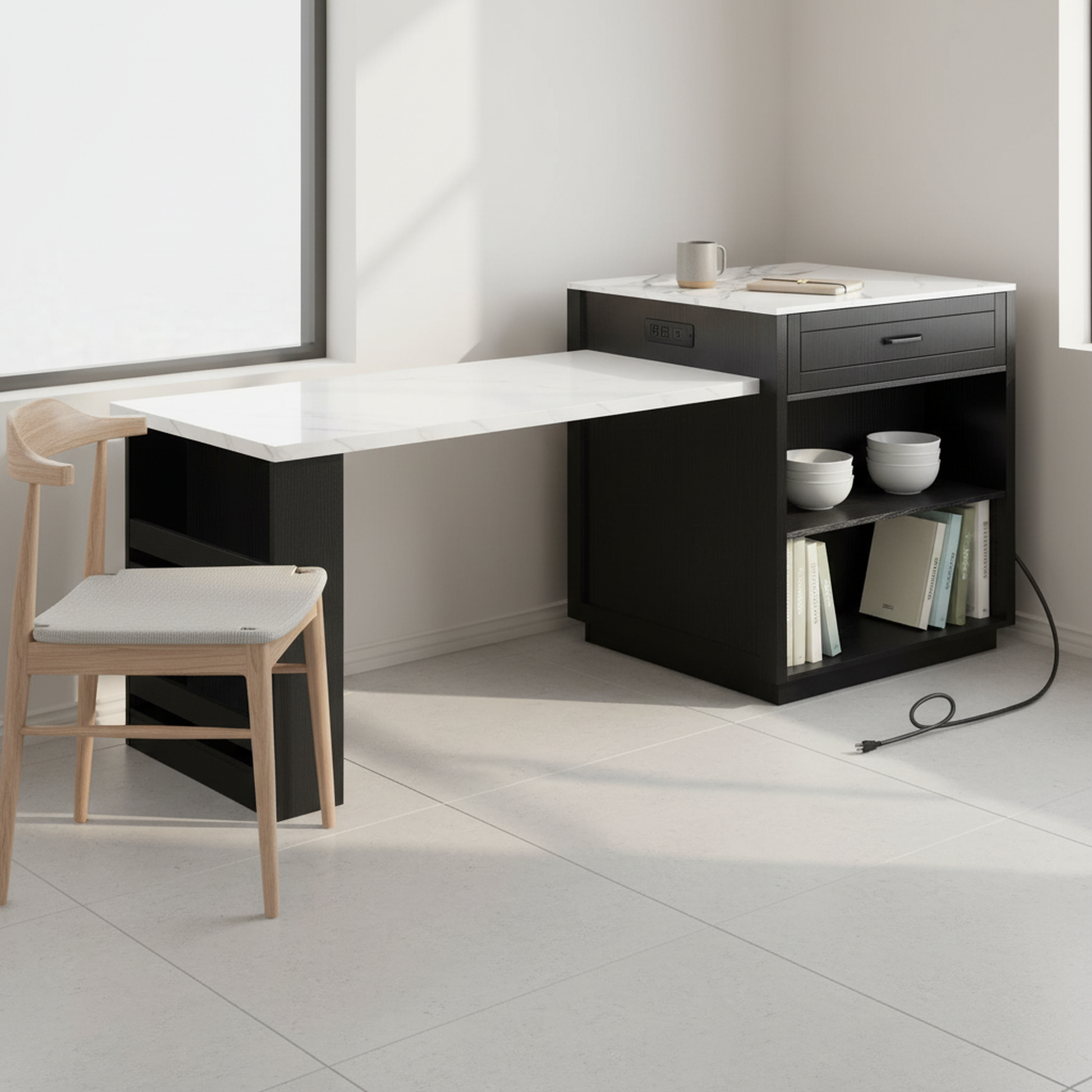 Designed to adapt throughout the day, Kinsey transitions easily from meal prep to casual dining at standard dining-table height. Built-in storage, smooth mobility, and integrated power make it a practical centerpiece for cooking, working, and gathering—without overwhelming the room.