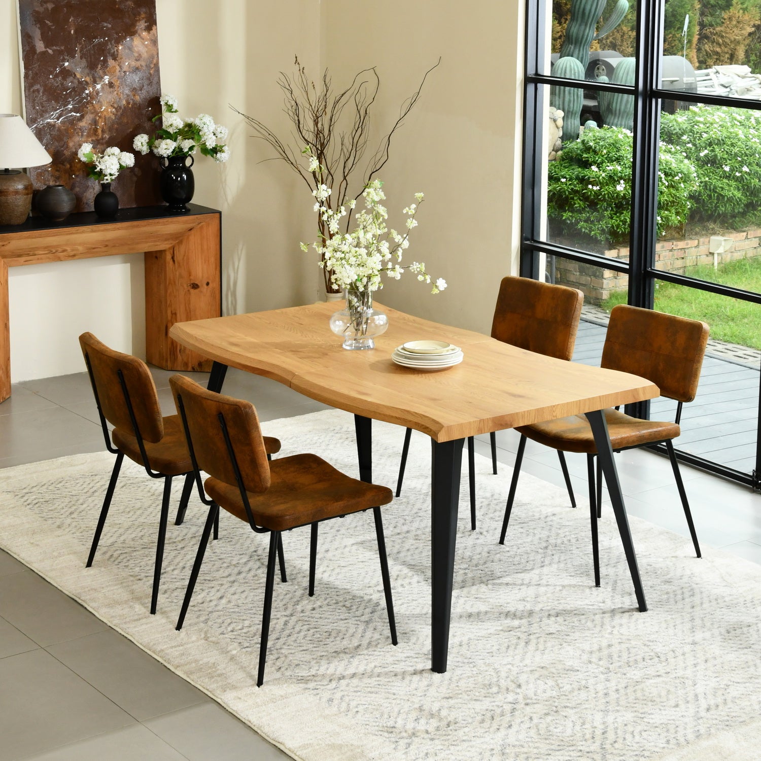 Warm textures and clean lines come together beautifully in this 5-piece dining set, pairing the Lancelot table with four Pomona faux suede chairs. The table’s wave-edge wood-look top adds an organic touch that softens modern spaces, while the black metal legs keep the silhouette sleek and versatile. It’s a design that works effortlessly in open-concept homes, compact dining areas, and casual everyday settings.