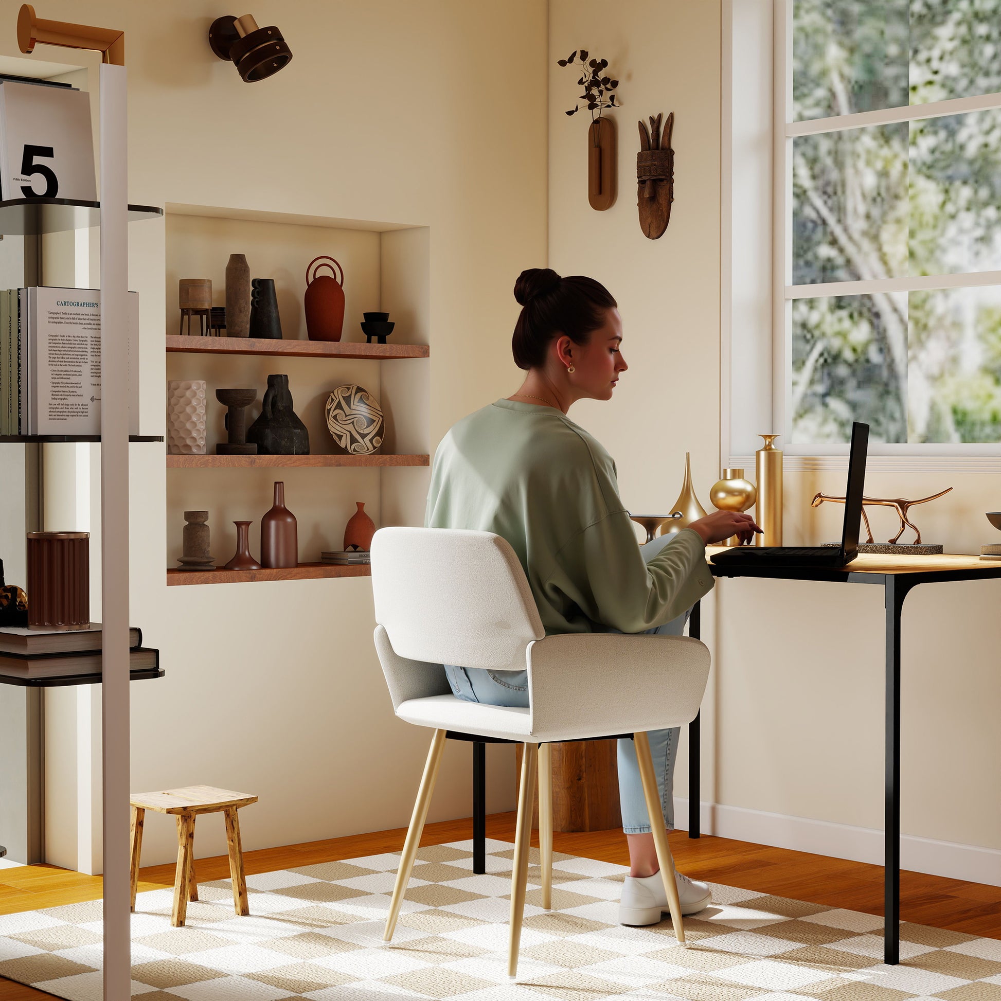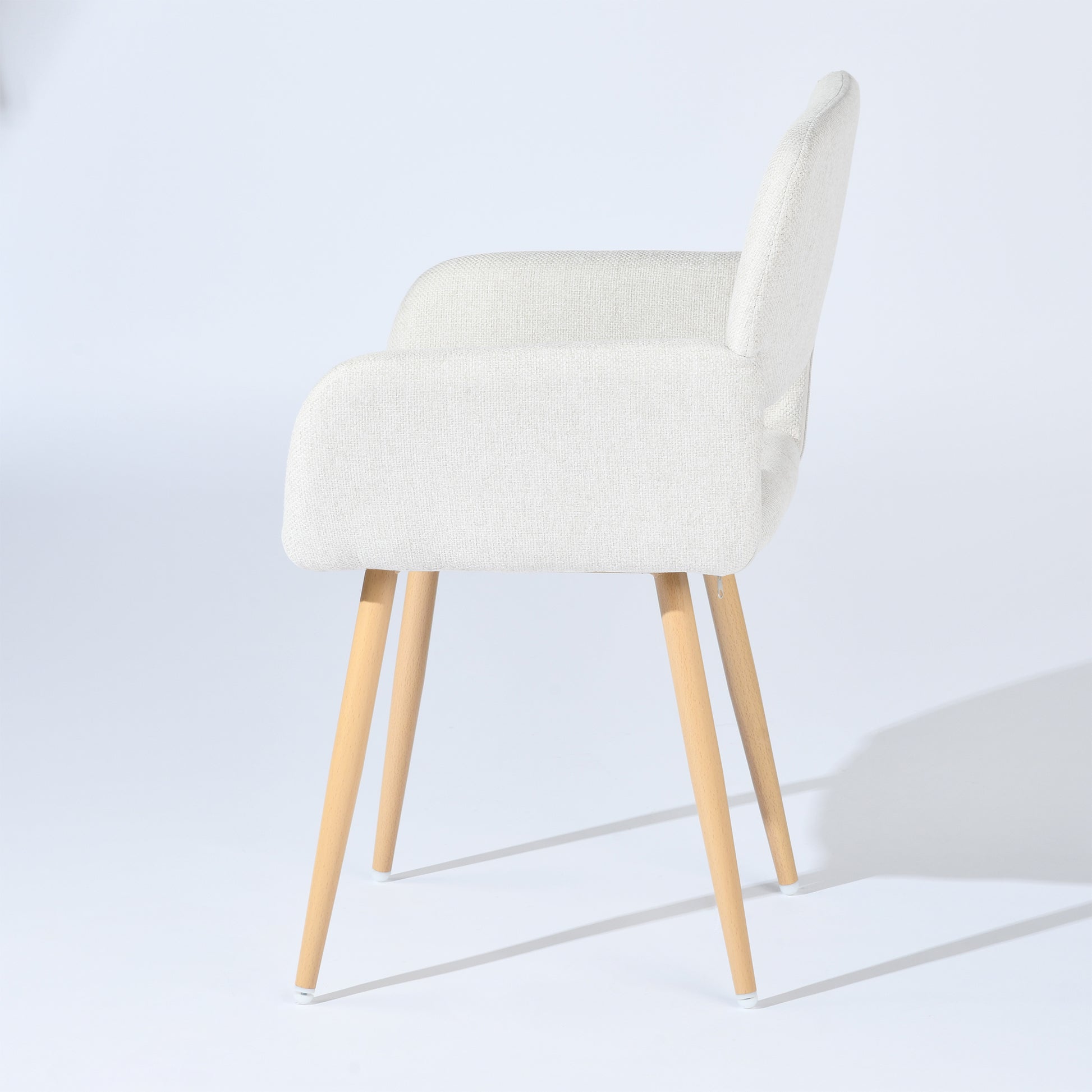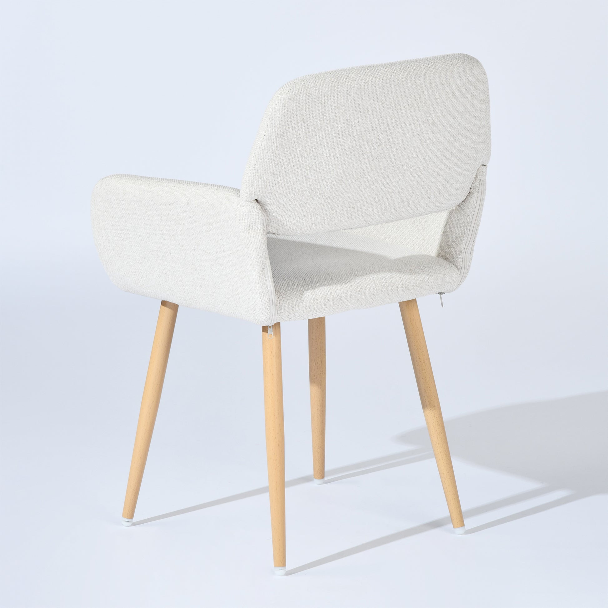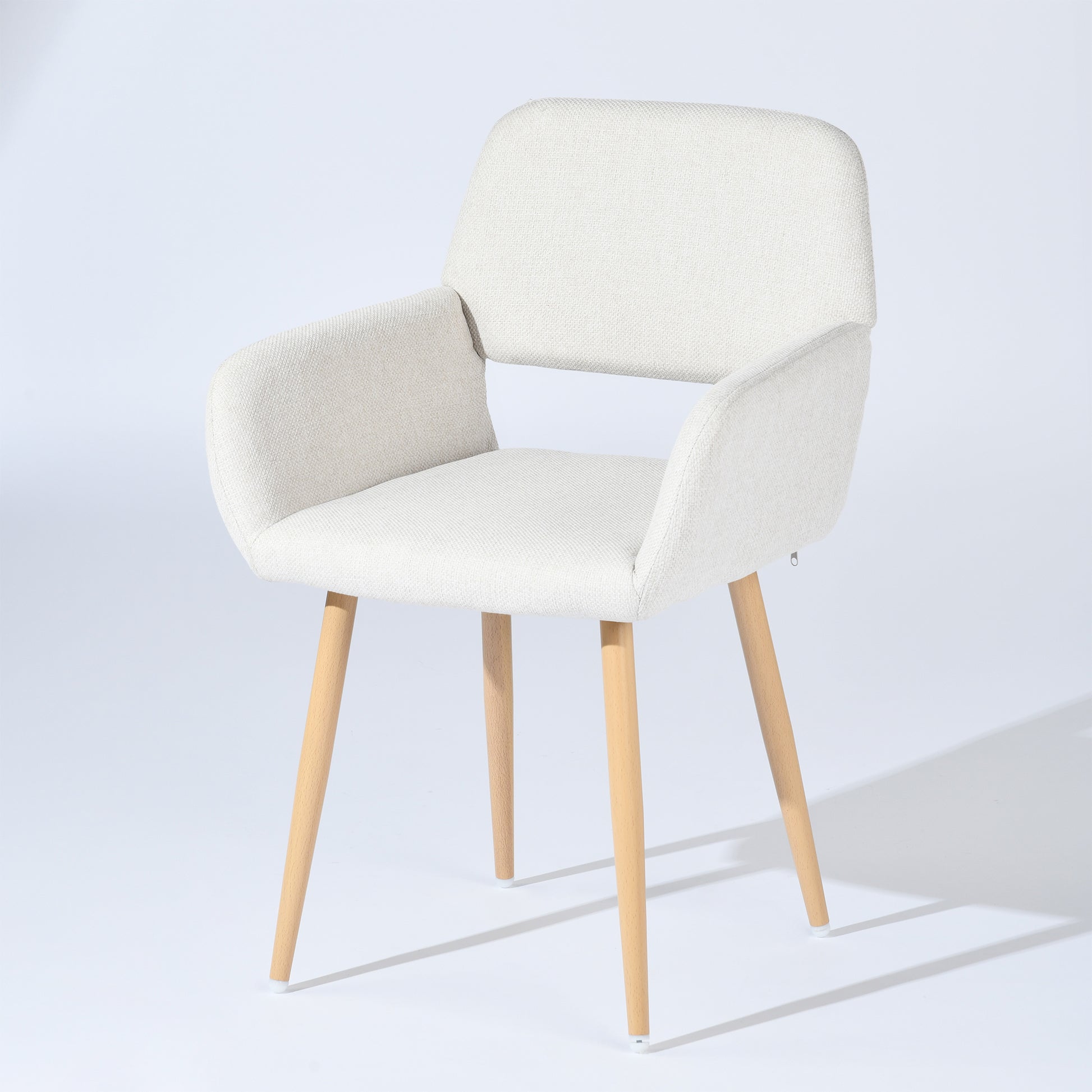 Slim metal legs wrapped in a light wood-look finish give the chair a warm, natural appearance without the upkeep of real wood. The compact shape fits beautifully in condos, apartments, and modern dining rooms, while the armrest cut-out keeps the profile airy and open. It’s a functional, comfortable, and stylish option for homes that want a soft, minimalist touch.
