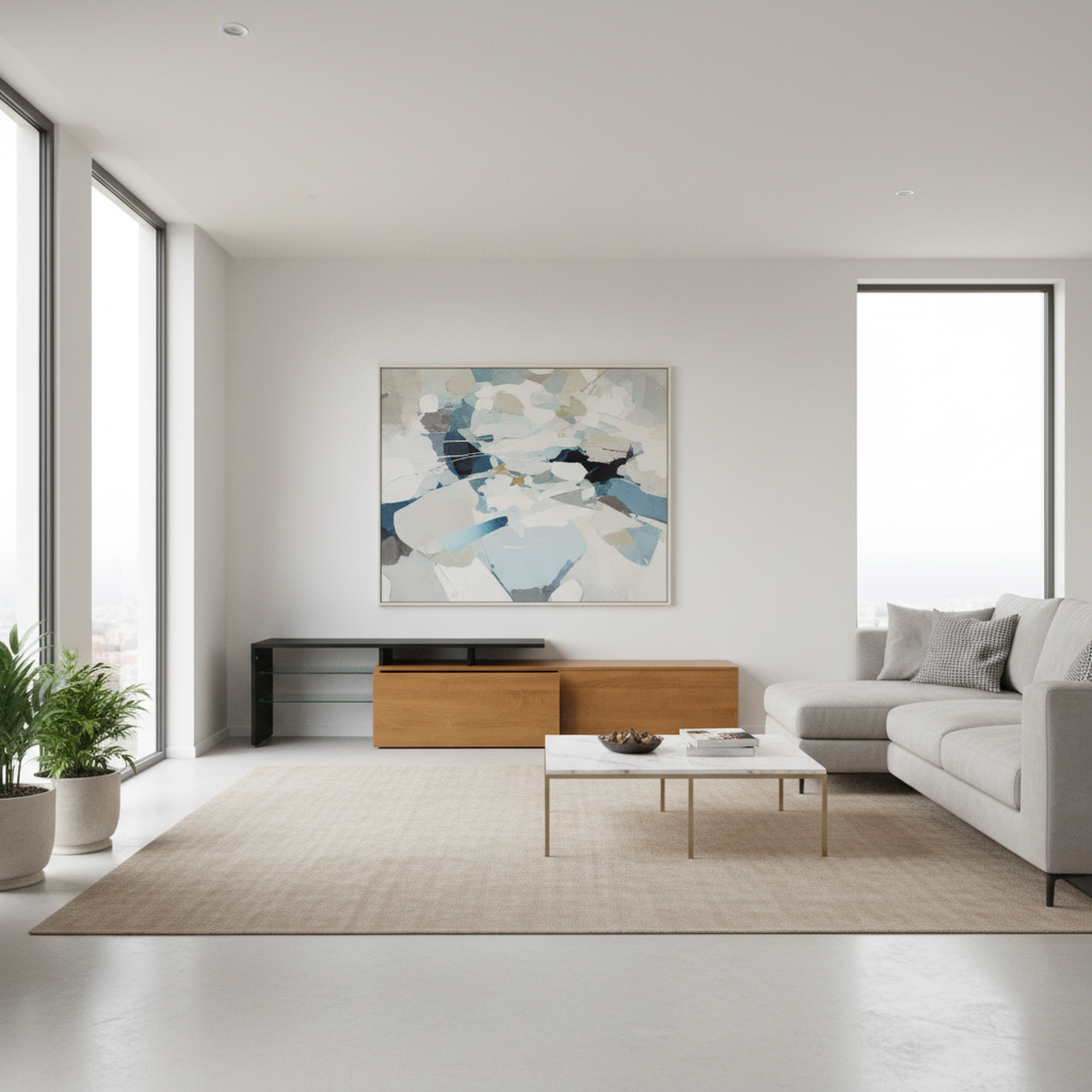 - Open shelving supports media devices and decorative pieces