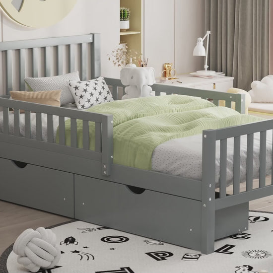 Finished in a versatile grey tone, this twin platform bed blends easily with neutral palettes, playful accents, or more mature decor as your child grows. Two integrated storage drawers beneath the bed provide practical space for toys, linens, and essentials, helping keep bedrooms organized and clutter-free.