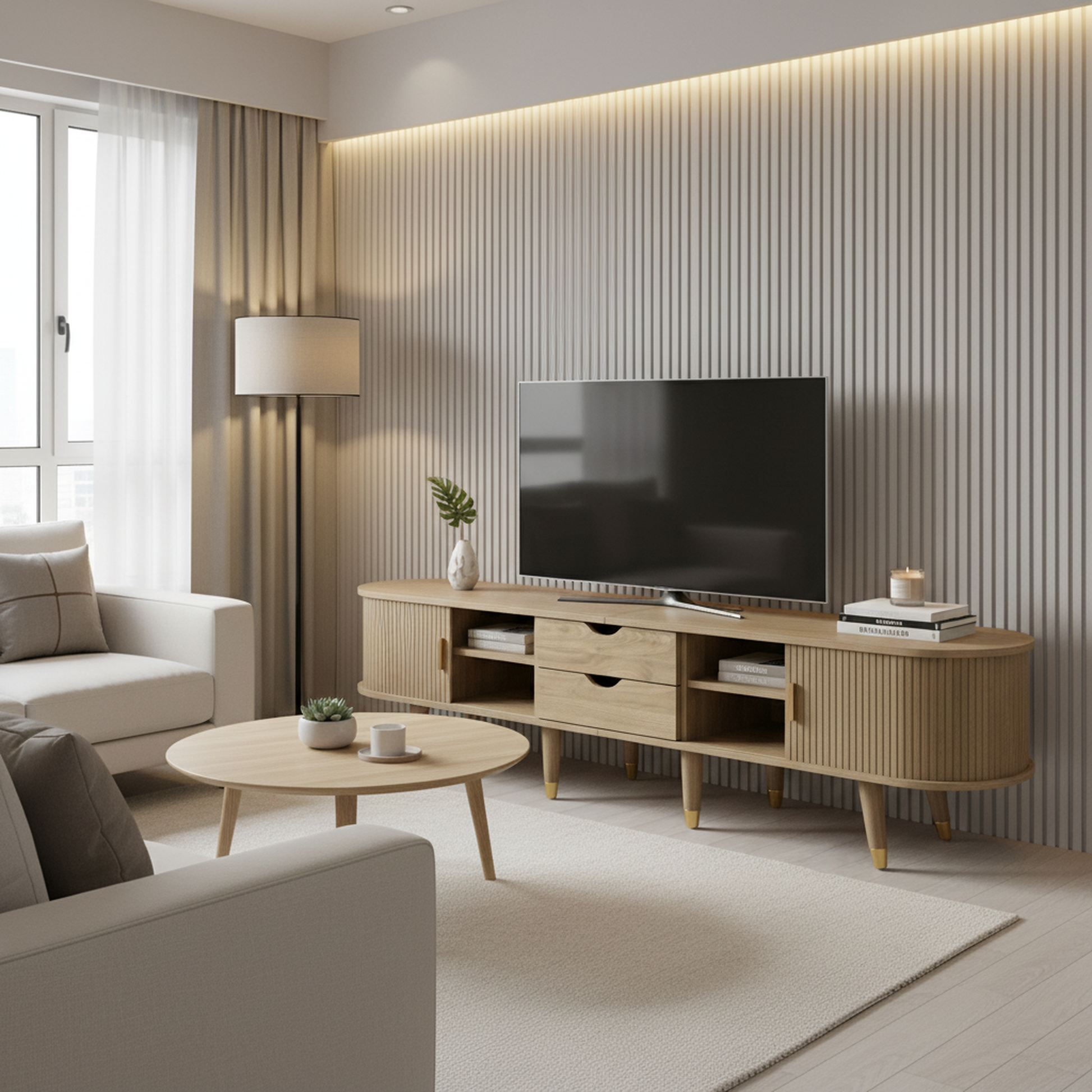 Westmere brings a refined, furniture-forward feel to your living room with a softly rounded silhouette and vertical slatted detailing that adds warmth without visual heaviness. Inspired by mid-century modern proportions, its low profile and tapered legs give the piece a timeless sense of balance that feels both familiar and current.
